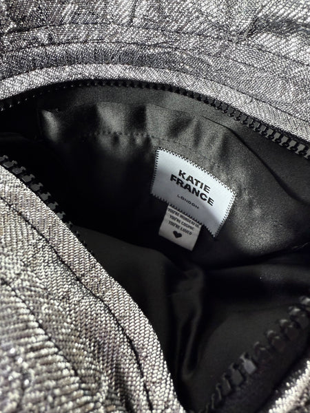 Made from silver metallic fabric and 15cm long black fringe. This bag is padded to hold its shape. Zip closing. Black lined 💘